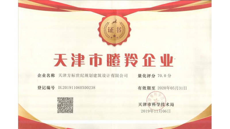 天津方标世纪规划建筑设计有限公司首批入库“天津瞪羚企业”(天津河西区仅3家),今后将更加致力于科技创新,激发企业的创活力,为津沽大地迸发的活力增添自己的力量。