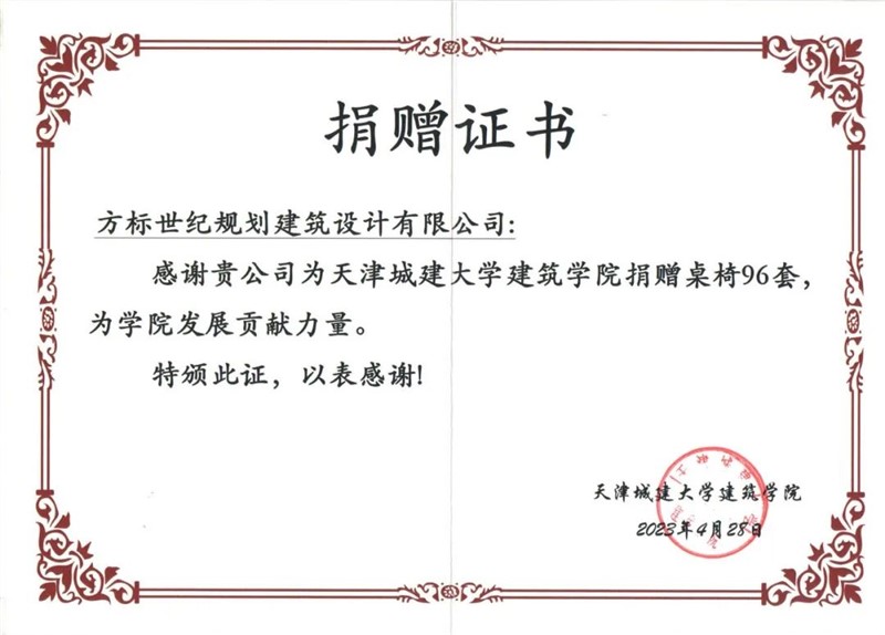 天津方标世纪规划建筑设计有限公司在致力于全面发展的同时,一直在关注着教育事业的发展,关心着学生们的成长。一直以回馈社会、支持社会公益事业为己任,取之于社会、回馈社会,本次捐赠的96组学习桌椅也只是代表天津方标世纪规划建筑设计有限公司全体人员为社会发展所尽的绵薄之力。